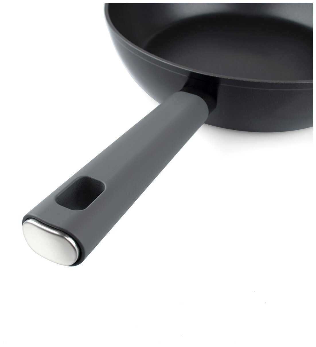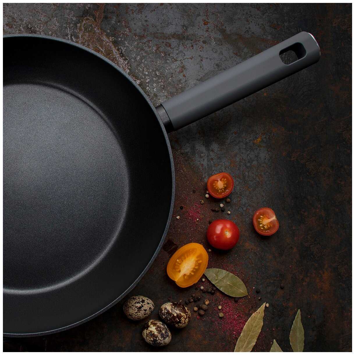 Высокие борта — главная отличительная черта модели, которую активно хвалят за универсальность. Они позволяют не только жарить, но и тушить овощи, готовить рагу и даже использовать сковороду как сотейник. Многие отмечают, что такая глубина предотвращает разбрызгивание масла и упрощает перемешивание лопаткой. -