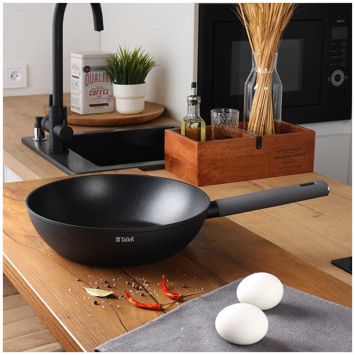 Сковорода Taller позиционируется как гибридный вариант между классической сковородой и сотейником, что подтверждается многочисленными отзывами о её высокой функциональности. Высота бортов в 7.5 см при диаметре 28 см позволяет готовить объемные блюда вроде жареной картошки с луком или рагу без разбрызгивания, при этом сохраняя преимущества сковороды для быстрой обжарки. Особенно отмечается удобство работы лопаткой благодаря продуманному углу перехода от дна к стенкам. Модель подходит для всех типов плит, включая индукционные, где демонстрирует мгновенный нагрев без потери равномерности прогрева. Однако несколько пользователей столкнулись с дисбалансом из-за тяжелой ручки на газовых решетках.