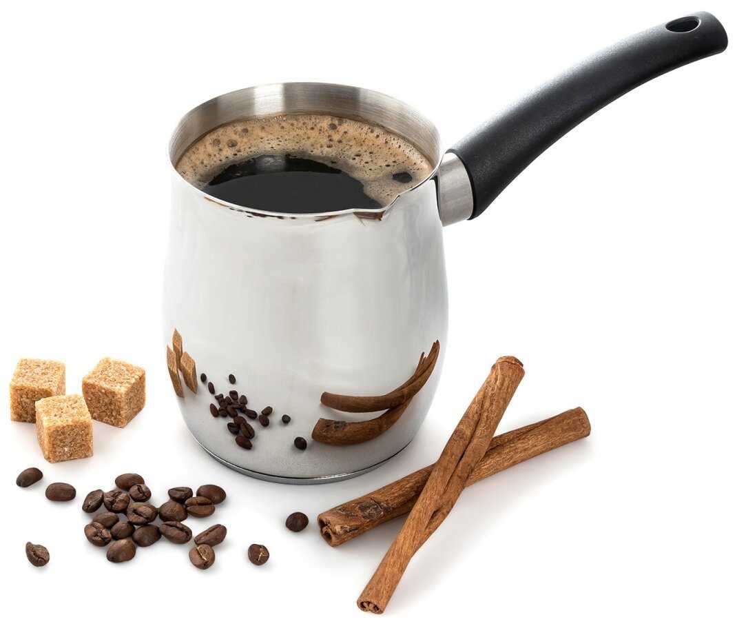 - Ручка из бакелита или композитного материала не нагревается во время варки, что позволяет безопасно обращаться с горячей туркой.