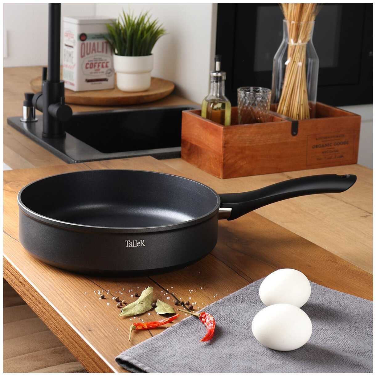 Итоговые достоинства и недостатки.К сильным сторонам можно отнести многофункциональность, эргономичную ручку, совместимость со всеми типами плит (с оговорками на индукцию) и удачное сочетание глубины с диаметром. Слабые стороны — нестабильное качество покрытия, риск деформации при транспортировке или нагреве, необходимость докупать крышку отдельно. Покупателям стоит проверять геометрию сковороды сразу после покупки и избегать абразивных средств при чистке. Для тех, кому важна долговечность, возможно, стоит рассмотреть более дорогие аналоги, но при аккуратной эксплуатации Taller остаётся достойным бюджетным вариантом.