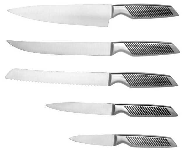 - Комплектация. В наборе 5 ножей: хлебный, овощной, поварской, разделочный и универсальный - базовый набор для большинства кухонных задач.