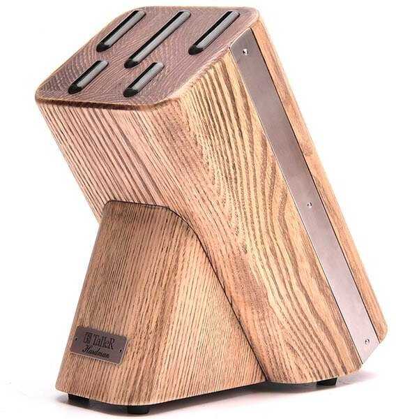 - Подставка. Деревянная подставка смотрится стильно, устойчивая, надёжно удерживает ножи. Удобно, что всё хранится в одном месте.