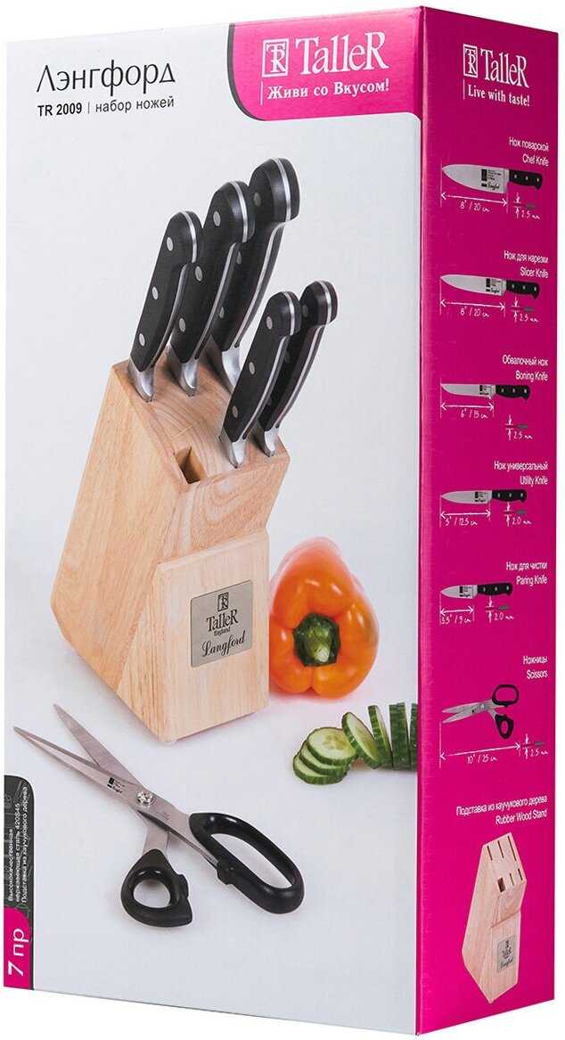 | Подробная комплектация : | нож поварской 20 см, нож для нарезки 20 см, обвалочный нож 15 см, нож универсальный 12, 5 см, нож для чистки 9 см, ножницы 25 см, подставка |