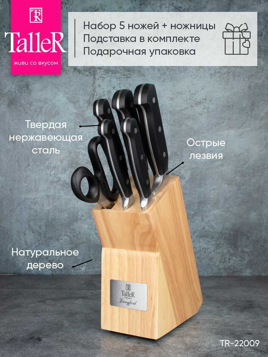 | Подробная комплектация : | нож поварской 20 см, нож для нарезки 20 см, обвалочный нож 15 см, нож универсальный 12, 5 см, нож для чистки 9 см, ножницы 25 см, подставка |