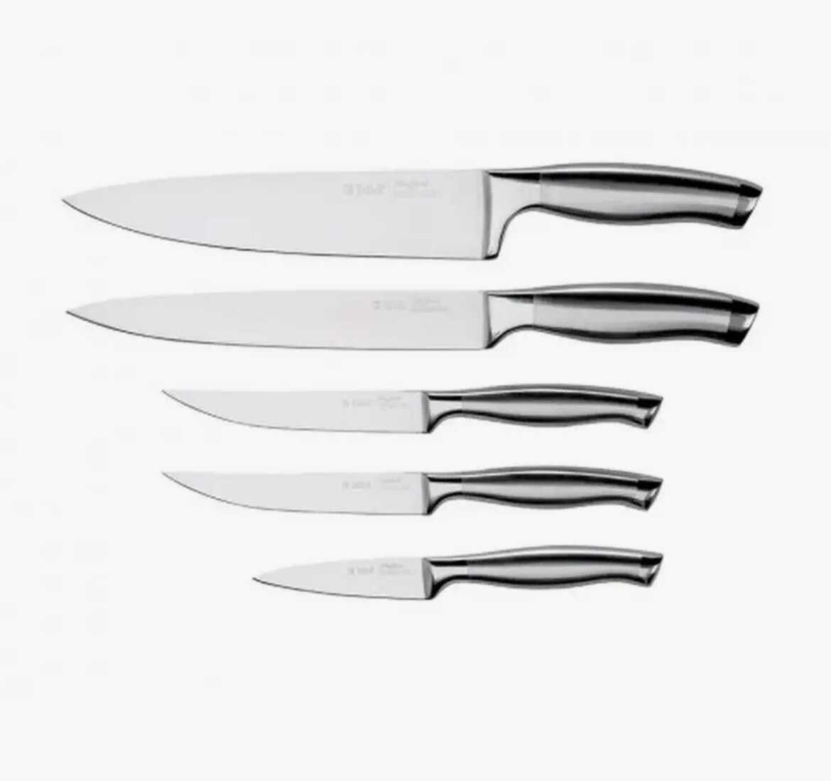 | Подробная комплектация : | нож поварской 20 см, 2, 5 мм нож для нарезки 20 см, 5 мм нож универсальный 12, 5 см, 2 мм - 2 шт. нож для чистки 8, 2 мм подставка |