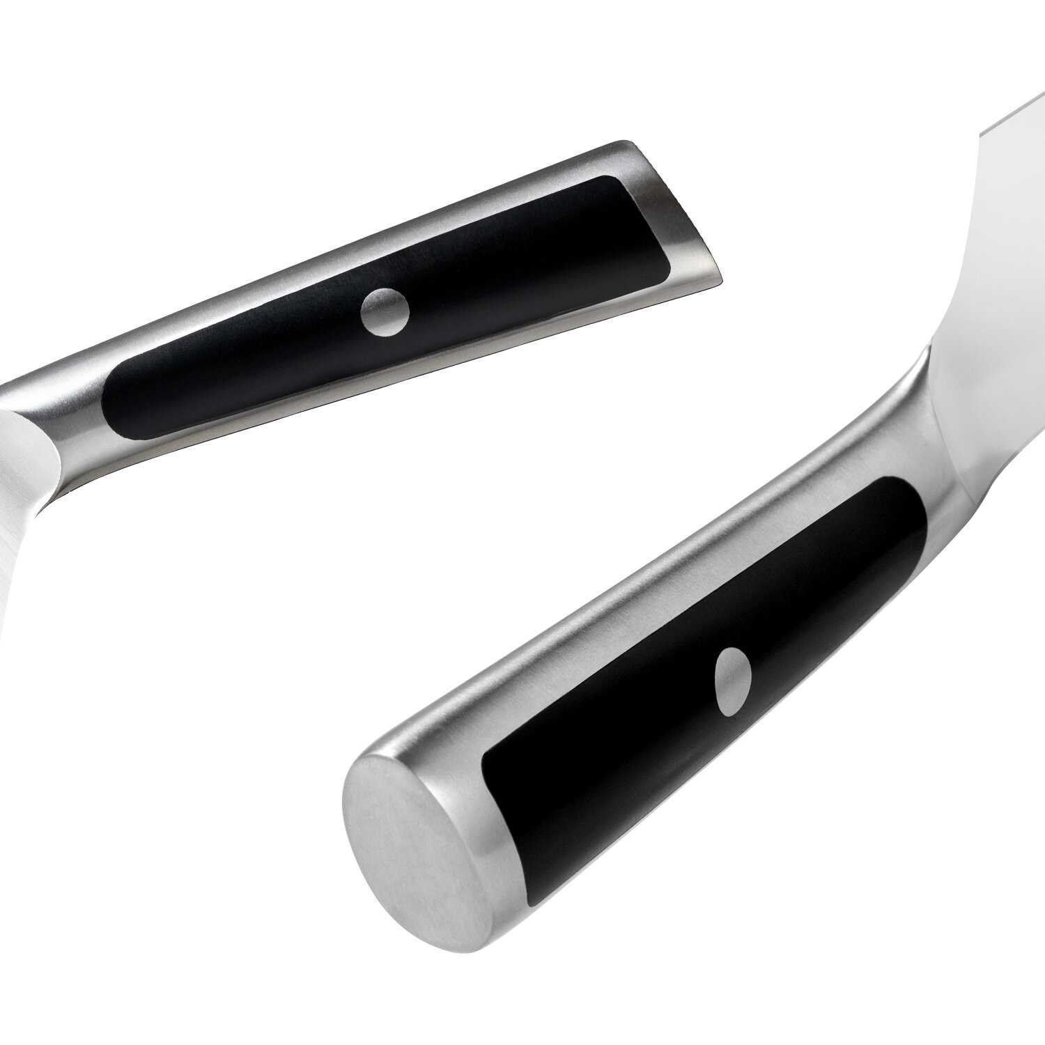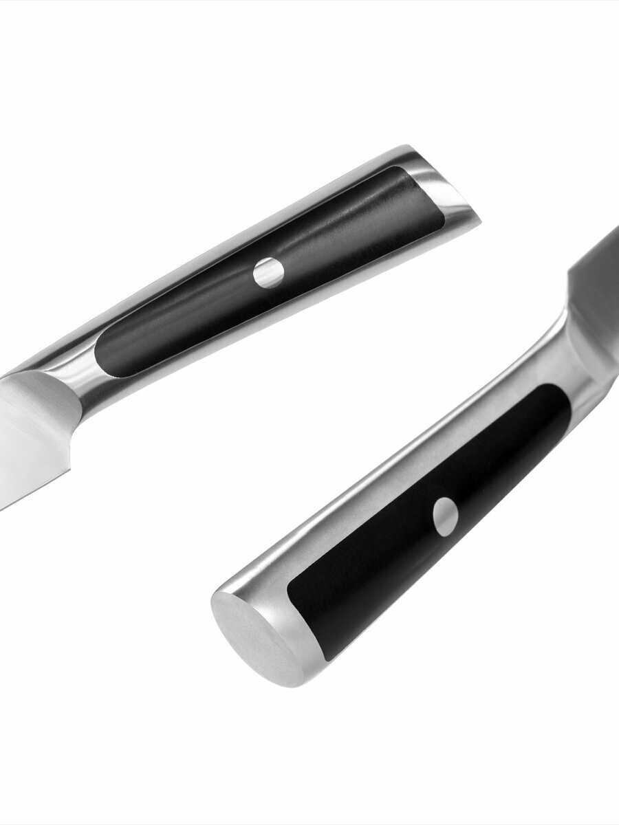 Нож очень удобный, хорошо сидит в руке , рукоятка в меру большая, не сильно тяжелая, вставки предотвращают от скольжения, не смотря на то, что они маленькие и только внутри рукоятки. Очень рекомендую, беру ещё два других ножа, один поменьше для чистки и один профессиональный