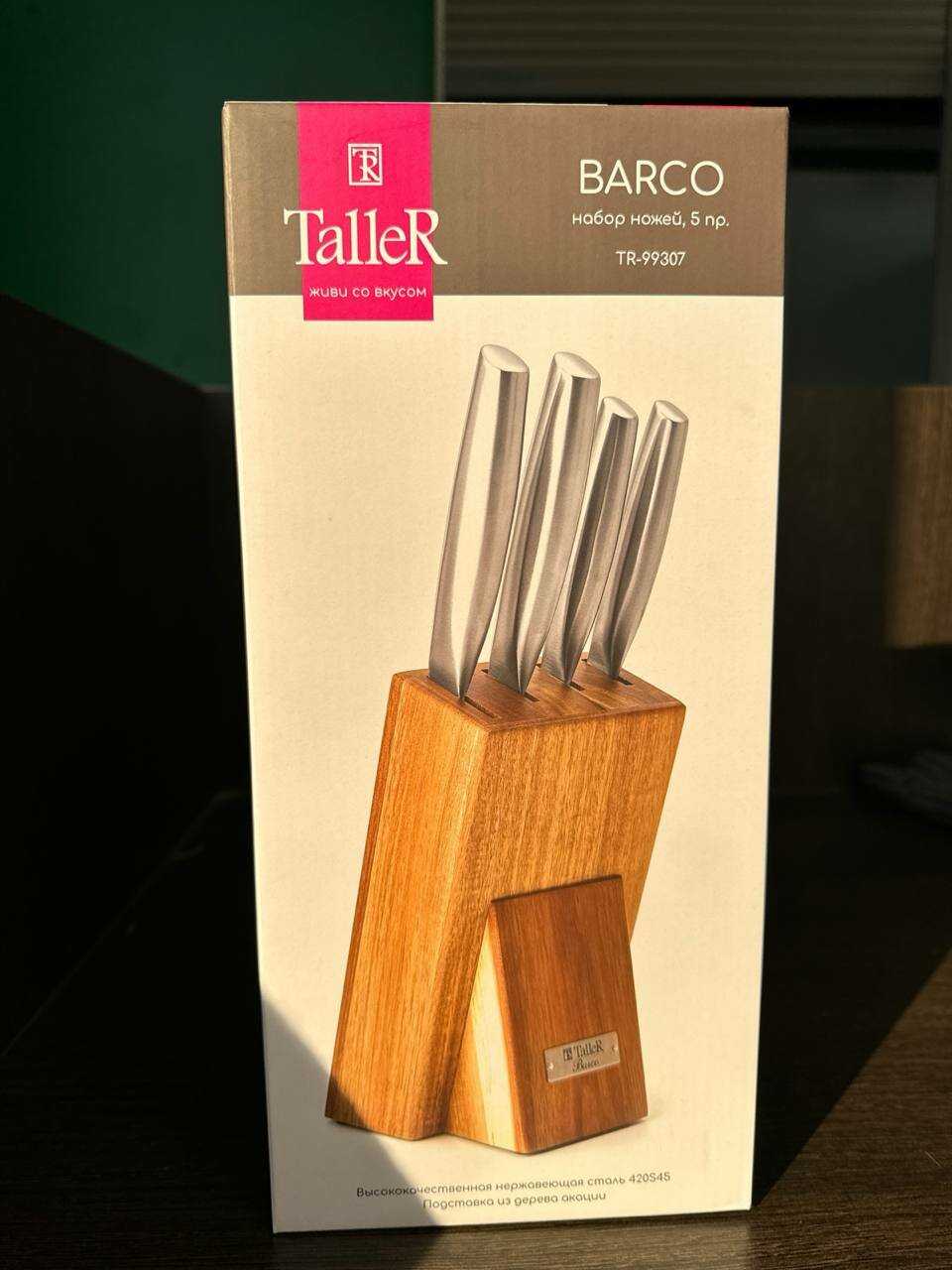 ножи Taller очень нравятся, есть набор которым пользуюсь более 10 лет. Этот надеюсь прослужит не меньше. Упакован был отлично, в две коробки, ни где не помят. Логотип на всех ножах, ручки не пустотелые.