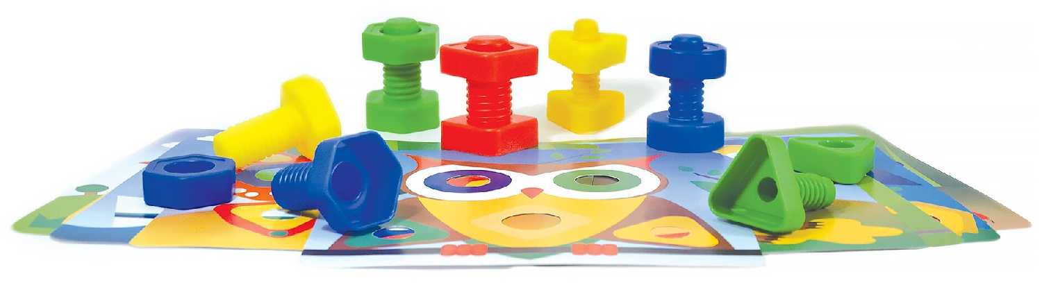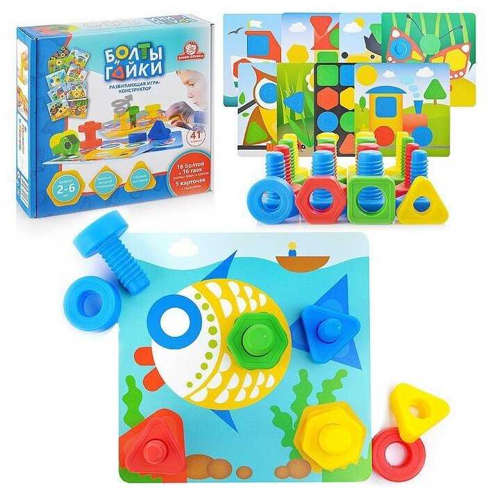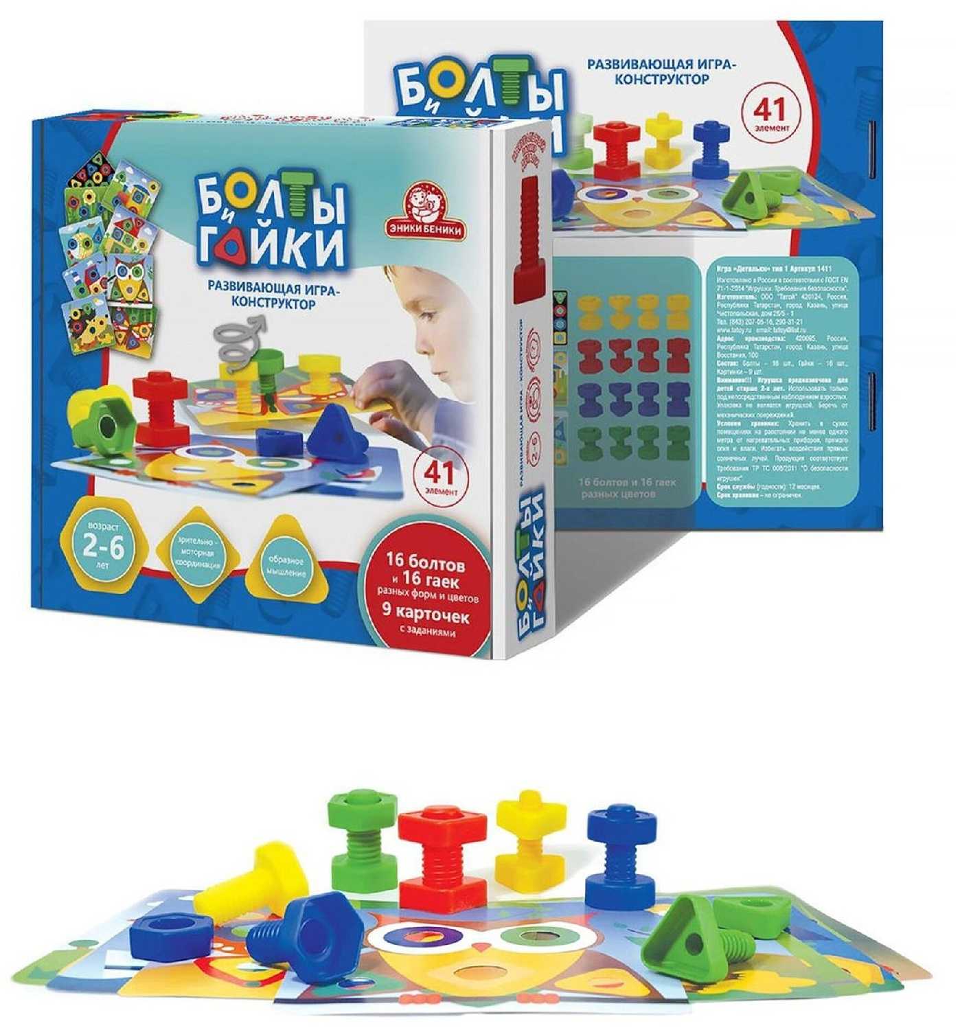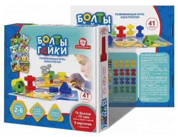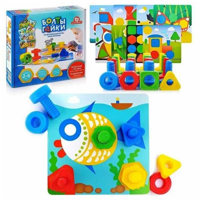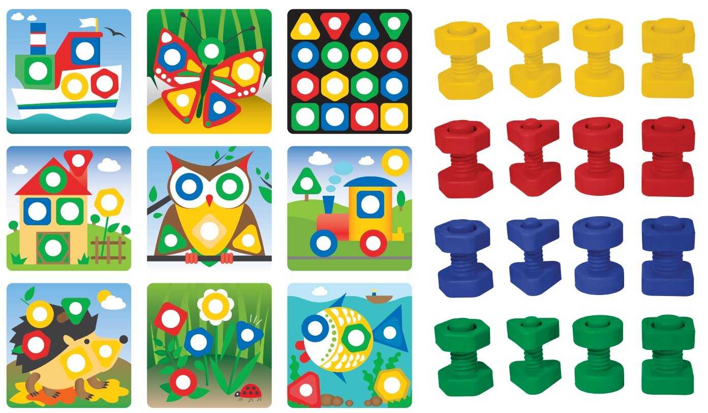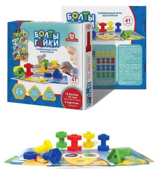 Комплектация : | в комплекте 16 болтов и 16 гаек четырёх разных цветов и форм (квадрат, треугольник, круг, шестиугольник), 9 двухсторонних красочных карточек |