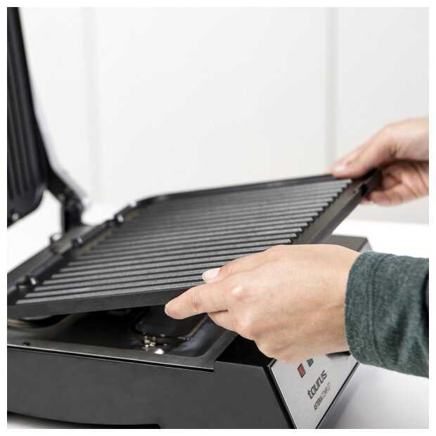 | Особенности : | антипригарное покрытие, контактный гриль, поддон для сбора жира, регулировка высоты верхней панели, съемные пластины |