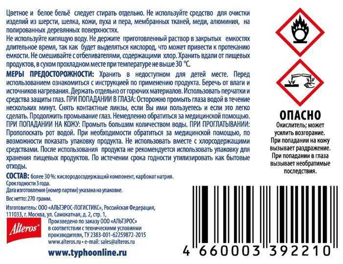 | Дополнительная информация : | Не используйте кипящую воду. Не держите приготовленный раствор в закрытых емкостях длительное время, так как будет выделяться кислород, что может привести к протеканию емкости. Не смешивайте с отбеливателями, содержащими хлор. Хранить вдали от пищевых продуктов в сухом прохладном месте при температуре не выше 30 °С. |
