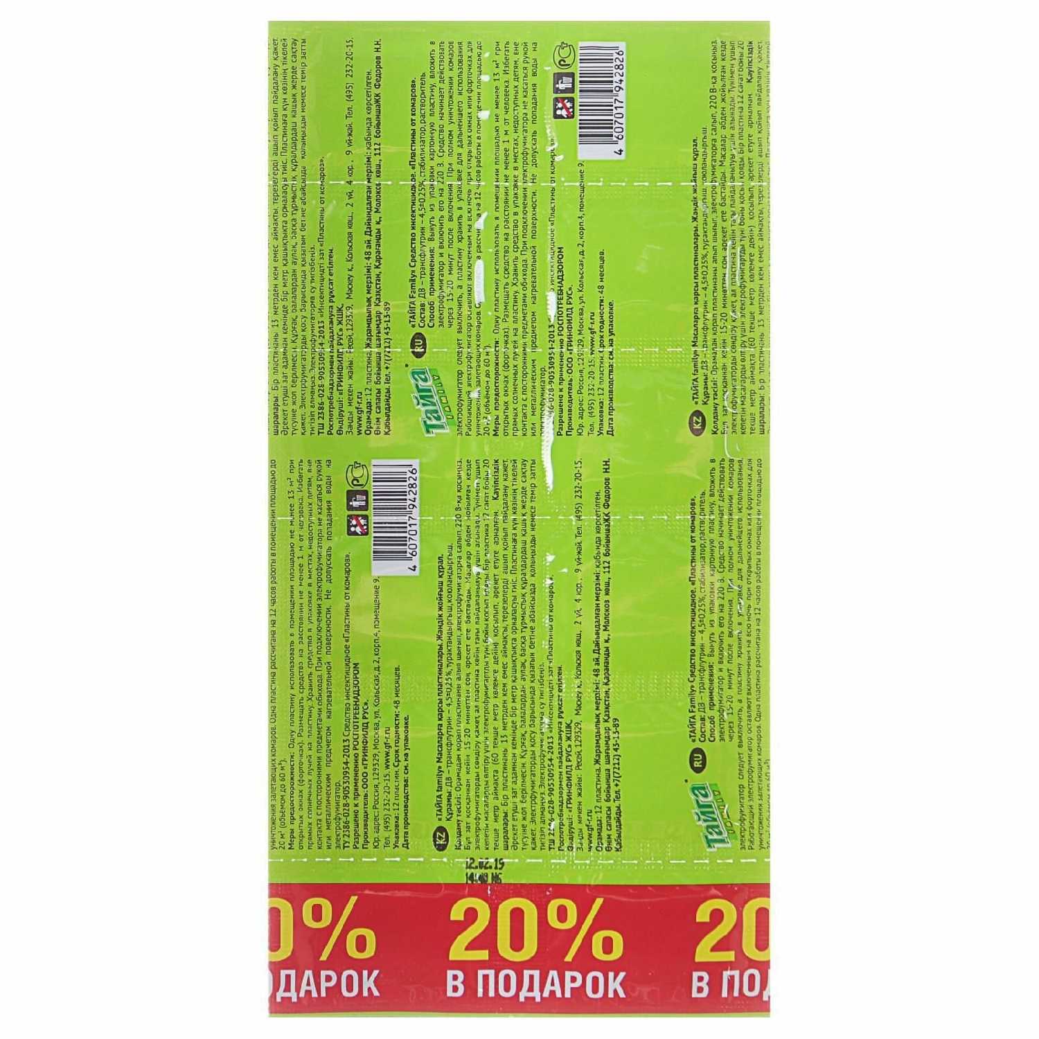 Дополнительная информация : | одну пластину использовать в помещении площадью не менее 13 м² при открытых окнах (форточках), рзмещать средство на расстоянии не менее 1 м от человека, избегать прямых солнечных лучей на пластину |
