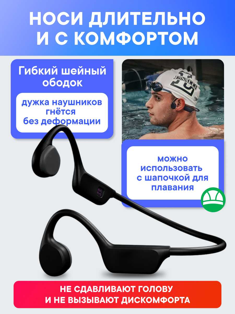 - + В целом всё что нужно, в этих наушниках есть. Держатся на голове хорошо + резинка из комплекта для обода наушников неплохо помогает. Объем памяти достаточен, звук в воде при плавании в бассейне более менее хорош.