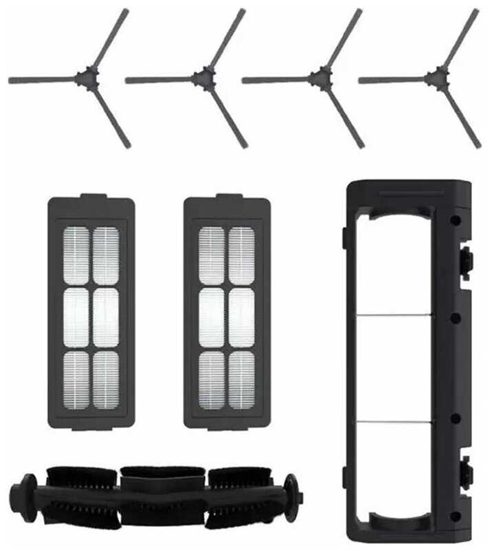 - В набор входят 2 запасные боковые щётки, HEPA-фильтр, 4 сменные тряпки для влажной уборки.