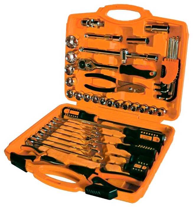 | Инструменты в комплекте : | бокорезы, вороток для головок, клещи, ключ разводной, ключи гаечные, ключи имбусовые (шестигранные), ключи торцевые, молоток, отвёртки, пассатижи, плоскогубцы, трещотка |