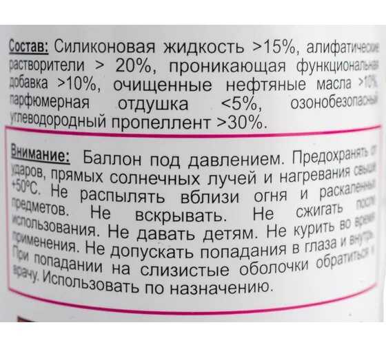 Состав : | силиконовое масло, минеральные масла, органические растворители |