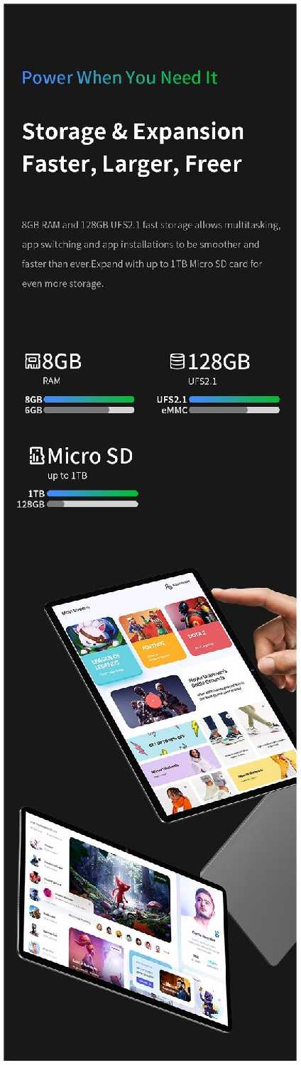 - 128 ГБ постоянной памяти + слот для microSD обеспечивают хранение крупных медиафайлов и игр.