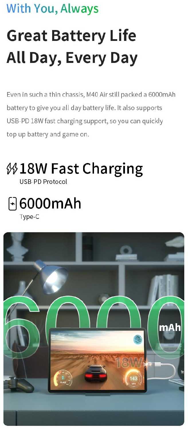 - Аккумулятор ёмкостью 7000-7500 мАч обеспечивает 6-8 часов непрерывного просмотра видео или игр.
