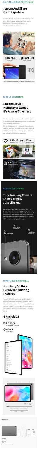 Металлический корпус придаёт планшету солидность, но увеличивает вес до 500–600 грамм, что ощущается при длительном удержании. Сборка качественная: падения с небольшой высоты на ковер или пол не оставляют повреждений, однако для защиты рекомендован противоударный чехол из-за риска деформации при серьёзных ударах. Разъёмы USB Type-C и слот для карты памяти microSD работают стабильно, а поддержка OTG позволяет подключать периферию, хотя одновременное использование адаптера для наушников и флешки невозможно. Отсутствие 3.5-мм аудиовыхода — распространённая проблема, решаемая переходниками, но это усложняет подключение проводных аксессуаров. Камеры выступают за корпус, повышая риск царапин при размещении на столе, поэтому владельцы советуют использовать подставку. Wi-Fi модуль демонстрирует нестабильность: в соседней комнате сигнал слабеет или пропадает, а одновременная работа Bluetooth-наушников может снижать скорость интернета. Для домашнего и офисного применения планшет надёжен, но в походных условиях его уязвимость требует замены на защищённые модели вроде Oukitel RT2.
