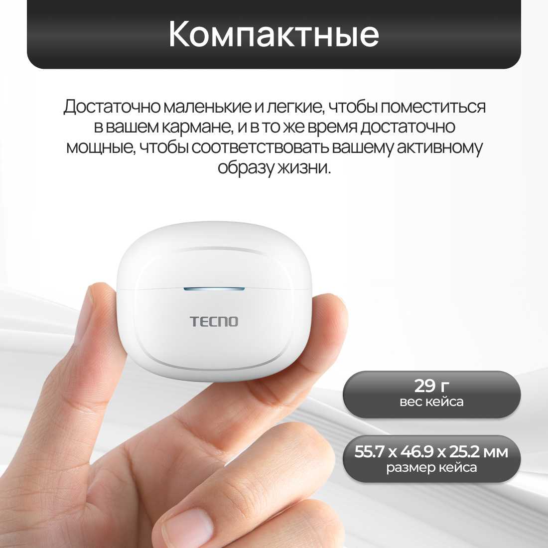- Мгновенное сопряжение с телефонами Tecno (Camon 30 Pro, Pova 6 Pro) с фирменной анимацией.