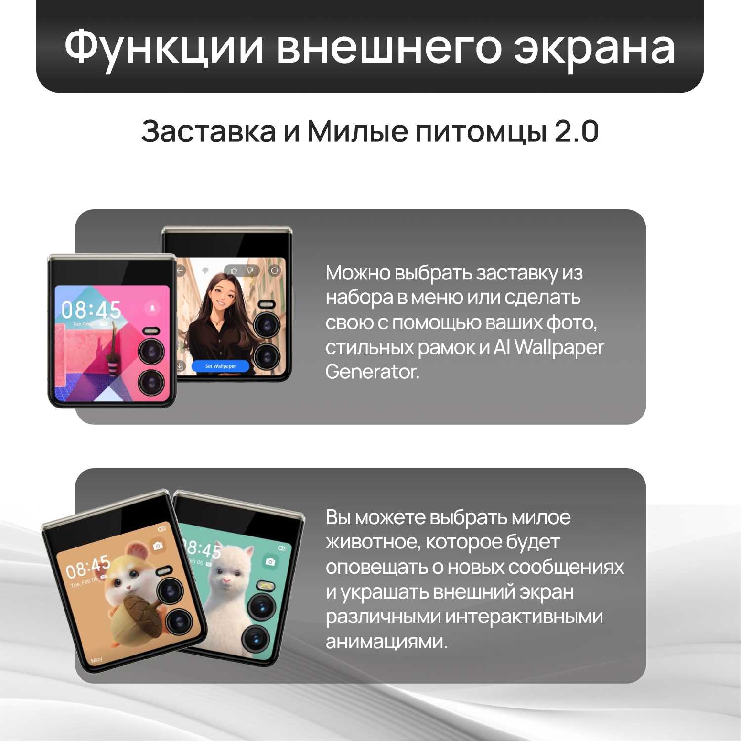 - Внешний экран поддерживает функциональные виджеты, уведомления и мини-игры, что позволяет использовать смартфон без раскрытия.
