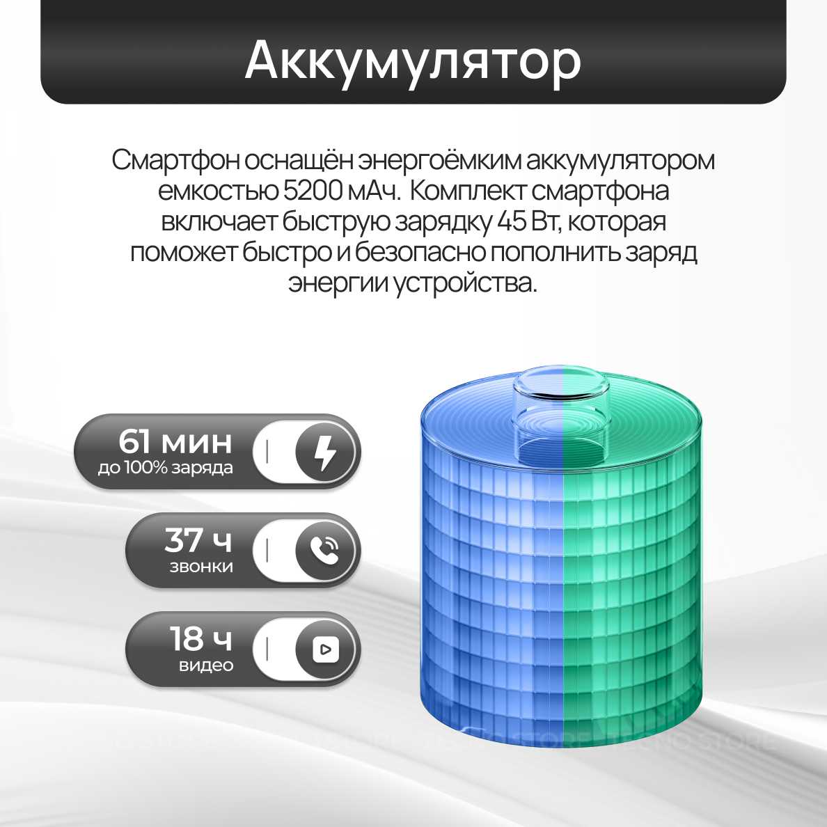 Батарея на 5160 мАч обычно хватает на полный день при умеренном использовании, включая звонки, соцсети и просмотр видео, с остатком 20–30% к вечеру. При включенных NFC, геолокации и Bluetooth автономность сохраняется на уровне 8–10 часов экрана. Зарядка 45 Вт позволяет полностью восстановить емкость менее чем за час с нуля до 100%. Однако некоторые пользователи жалуются на быстрый разряд при использовании ИИ-функций или в тяжелых играх, где батарея садится заметно быстрее. В целом, для повседневных задач автономность оценивается как хорошая, но не выдающаяся. -