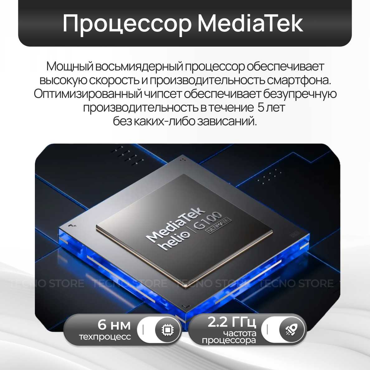 - Процессор Helio G100 обеспечивает плавную работу без лагов, приложения запускаются мгновенно, даже с несколькими открытыми в фоне.