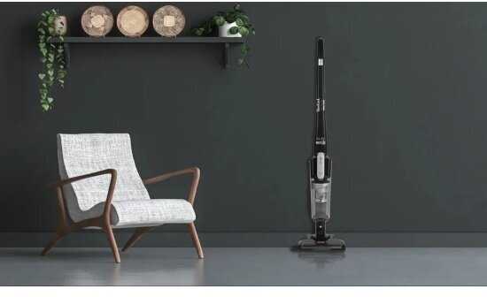 - Вертикальная конструкция и компактность упрощают хранение и быстрый доступ, позволяя закрепить пылесос на стене с помощью кронштейна.