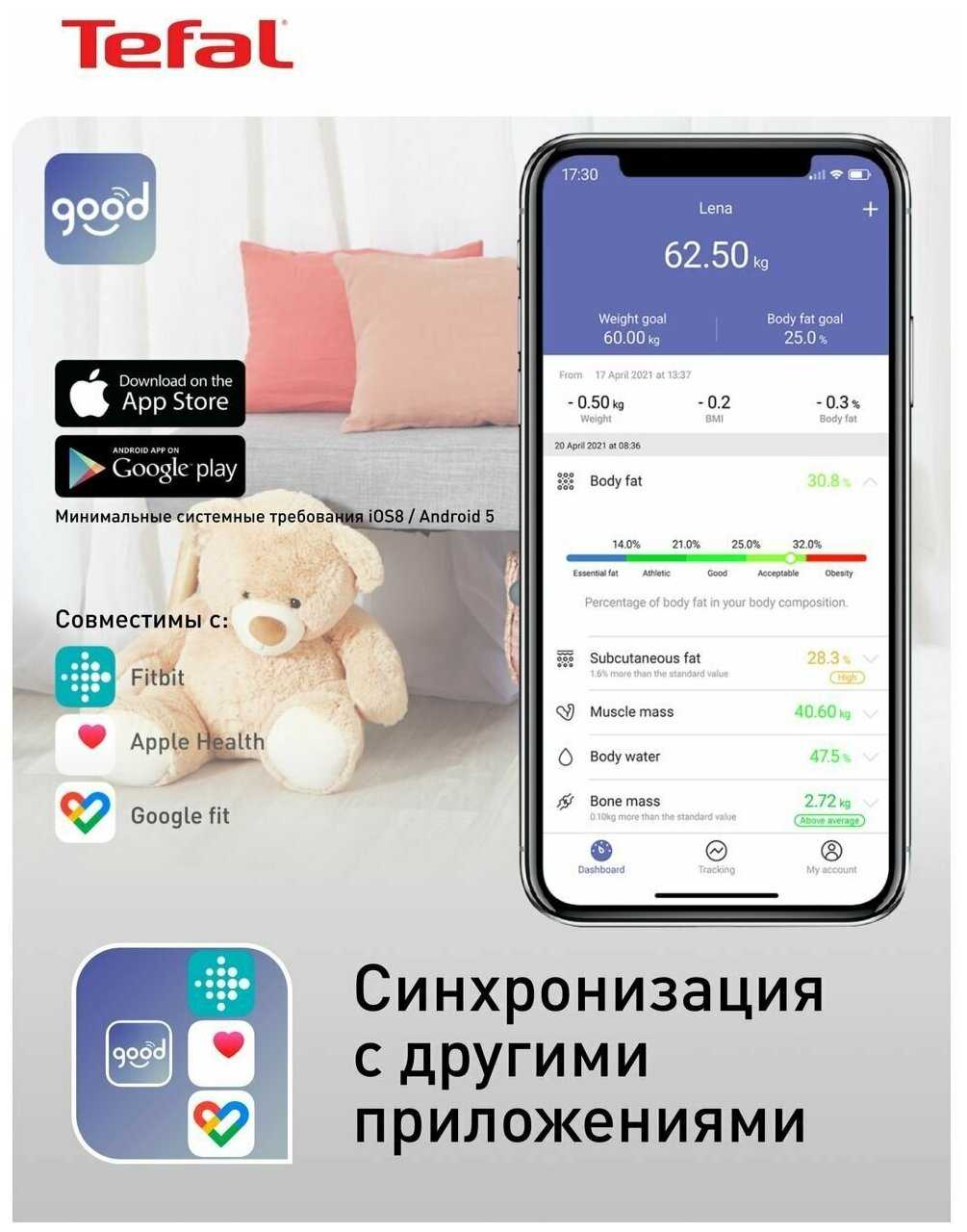 Напольные весы Tefal Goodvibes Life BM9600S1 - это умные весы, которые помимо взвешивания еще и анализируют 10 показателей тела.