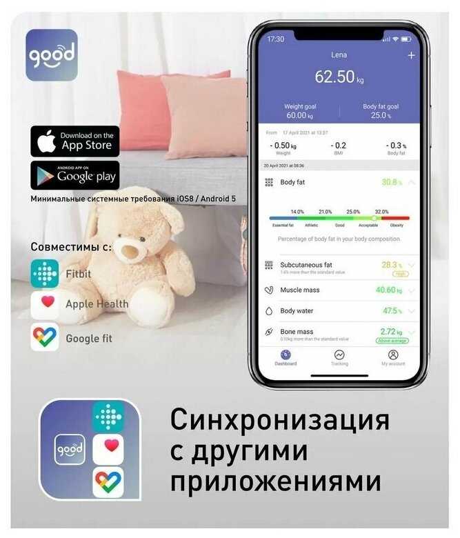 - + Функционал отличный, измеряют даже уровень подкожного жира и воду.