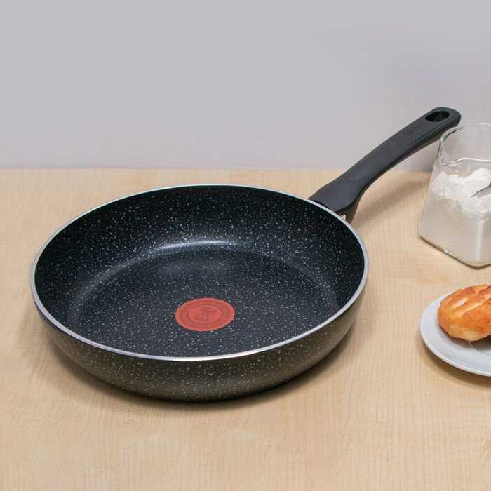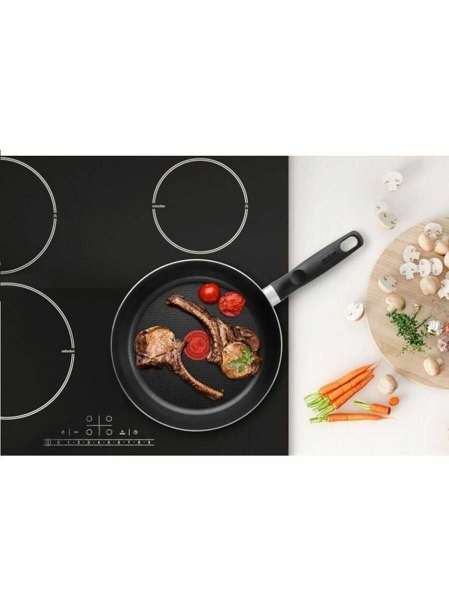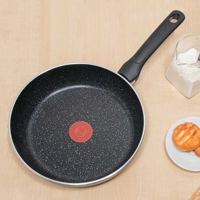 Термоиндикатор в виде кружка на дне сковороды меняет цвет по мере нагрева, сигнализируя о достижении оптимальной температуры для начала готовки. Пользователи высоко оценивают эту функцию, так как она исключает необходимость эмпирически проверять нагрев и помогает предотвратить преждевременное добавление продуктов. Когда индикатор становится равномерно красным, можно начинать готовить. -