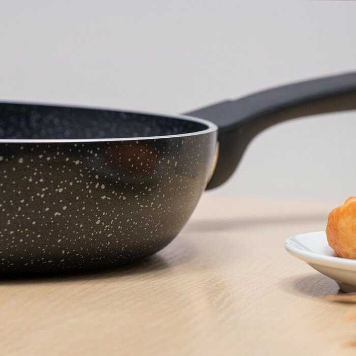 - Умеренный вес сковороды обеспечивает устойчивость на плите и удобство управления без излишней нагрузки на запястье.