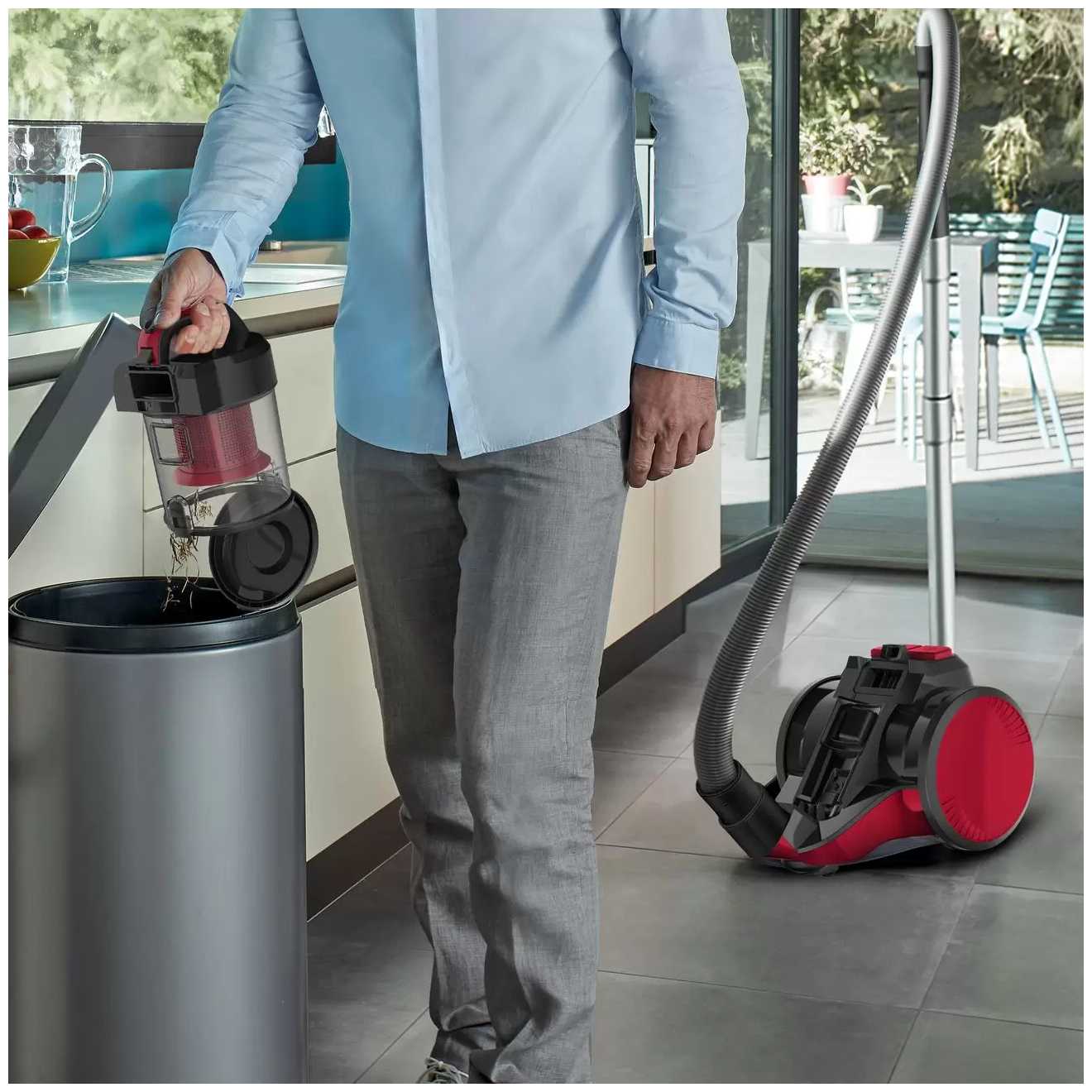 - Прозрачный пылесборник с нижним открытием позволяет контролировать заполнение и гигиенично избавляться от мусора.
