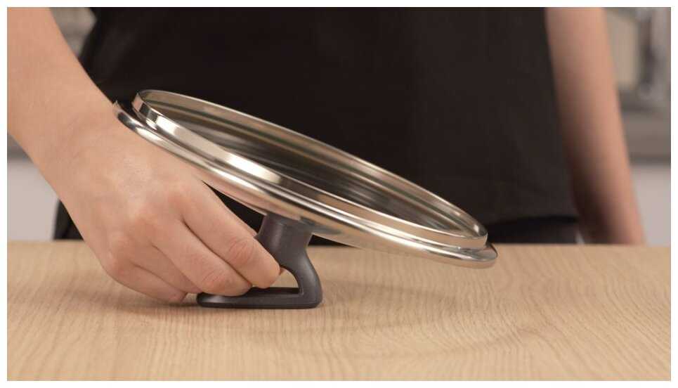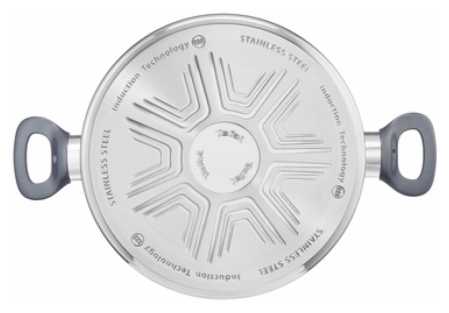 - + Великолепно работает с индукционной плитой, очень удобный дизайн ручек.