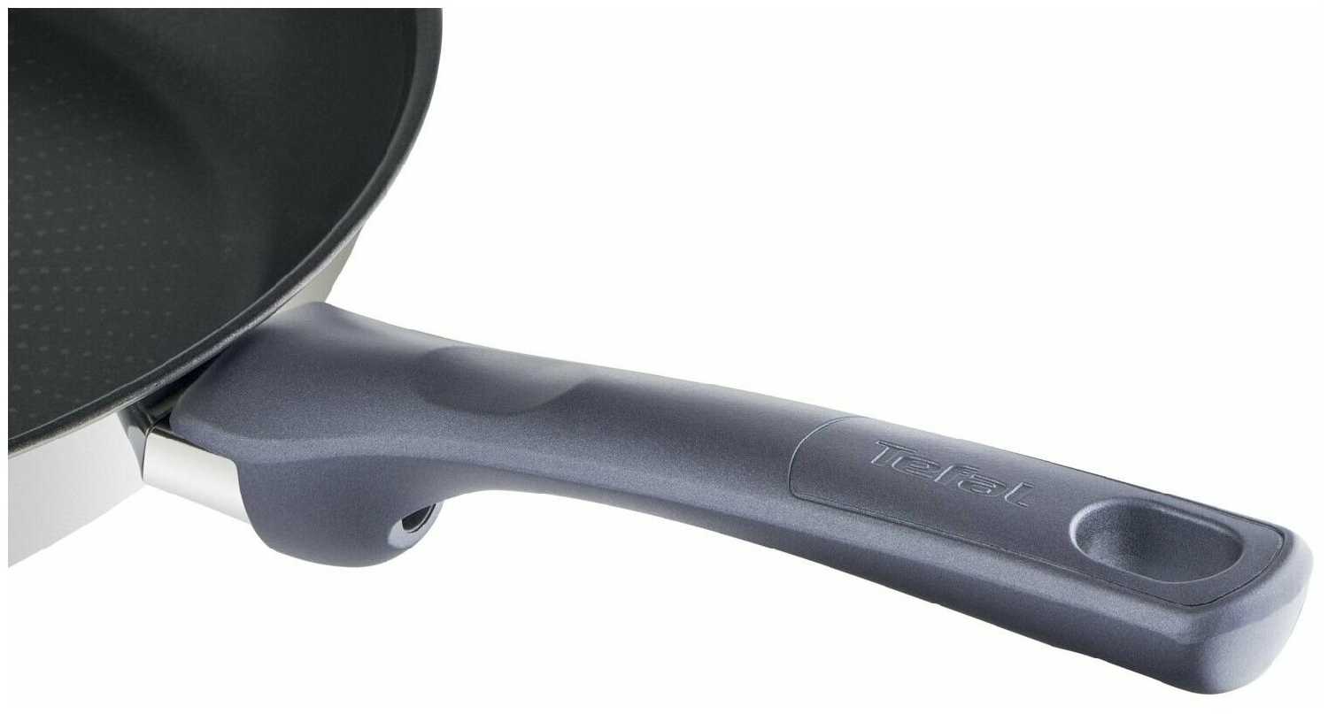 Сковорода Tefal имеет специальное тефлоновое покрытие из премиального титанового напыления, покрытие делает поверхность сковороды крайне гладкой и прочной. Благодаря этому, блюда не пригорают к стенкам сковороды, а на поверхности не появляются царапины. Кроме того, обслуживание сковороды после приготовления блюд занимает совсем немного времени, так как ее легко очистить от любых загрязнений.