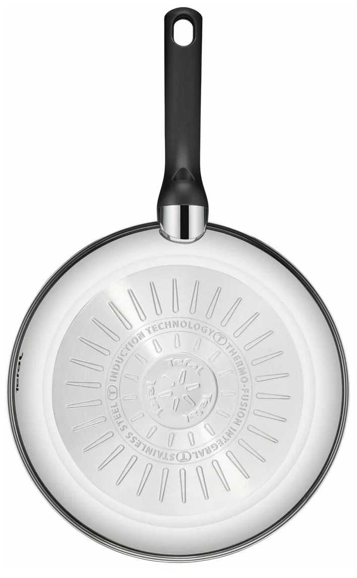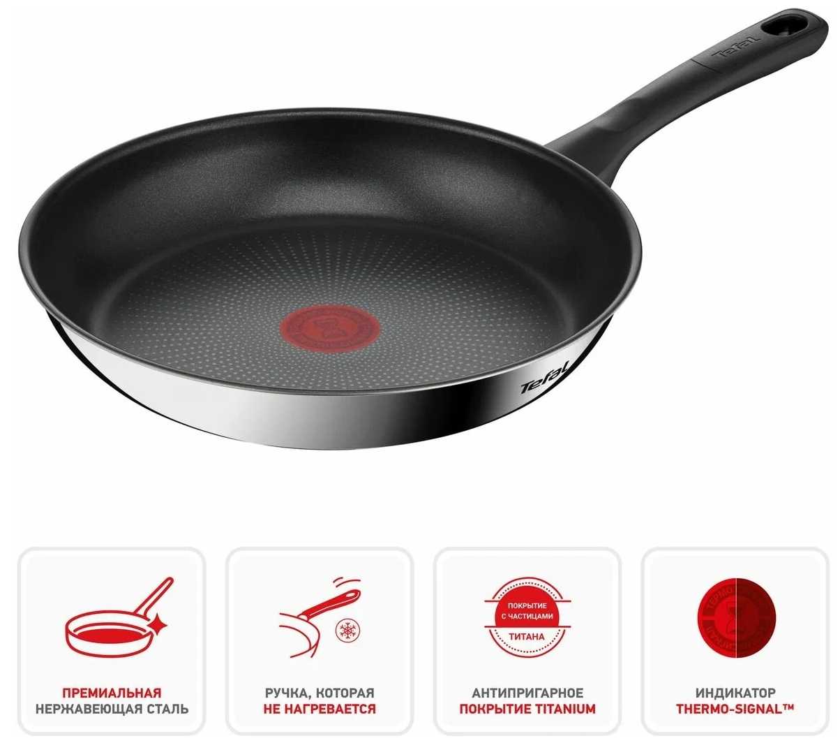 - + Отличная сковорода! В центре индикатор приготовления. При нагрев становится красного цвета. Покрытие не стирается! Ручка не греется. Случайно поставил в духовку и нагрел сковороду, ручка не поплавилась! Даже если покрытие будет поцарапано, это не вредно - корпус изготовлен из нержавеющей стали (а не из алюминия). Пользуюсь постоянно таким типом сковород, обратил внимание - покрытие Tefal дольше держится на сковородах из нержавеющей стали! Отличная цена!