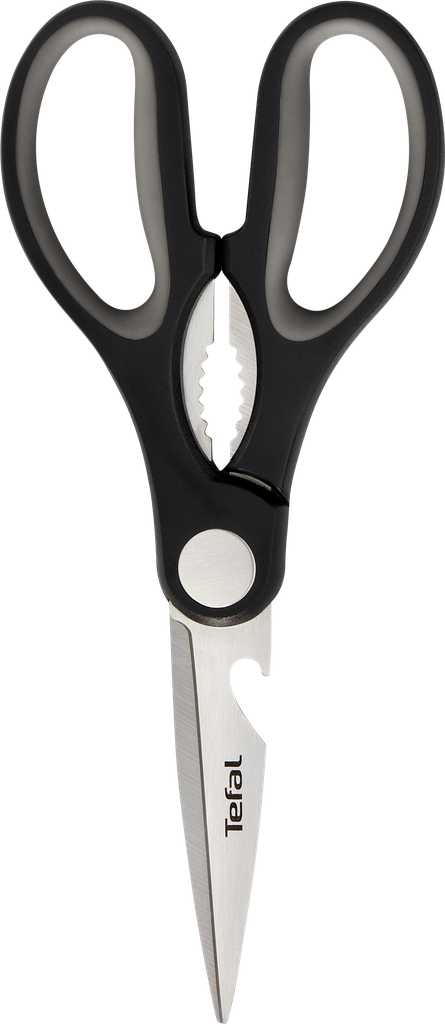 Ножницы имеют тройное назначение: режущая часть справляется с куриными костями и пищевой плёнкой, встроенный орехокол (овальное отверстие с зубцами) раскалывает грецкие орехи, а изогнутый выступ на рукоятке служит открывалкой для бутылок. Пользователи хвалят их за остроту и "женскую" эргономику, но отмечают люфт после интенсивного использования. -