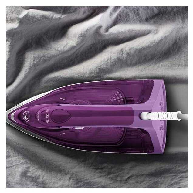 - Встроенный фильтр от накипи продлевает срок службы утюга, упрощая очистку под струей воды.