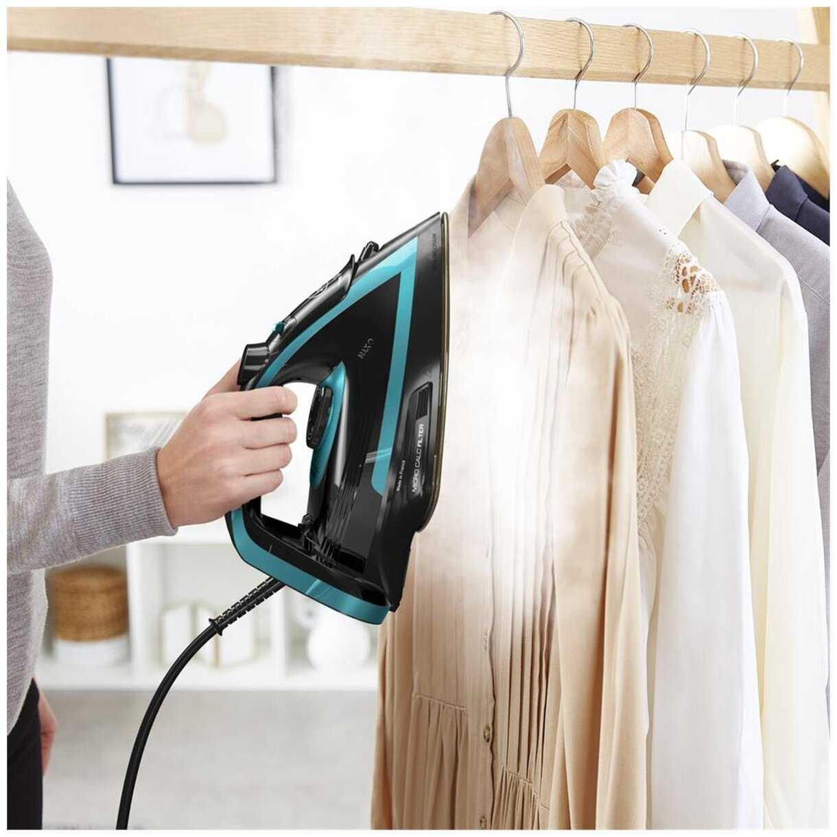 - Кнопка парового удара под указательным пальцем требует неестественного положения руки, вызывая усталость при длительной глажке.
