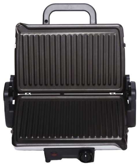 - - отсутствие кнопки выключения, отсутствие лотка для сбора жира, отсутствие индикации степени нагрева, отсутствие механизма, подстраивающего панели под толщину продукта, регулятор режима нагрева полностью неинформативен (болтается без щелчков и фиксации, возможно вообще ничего не регулирует)