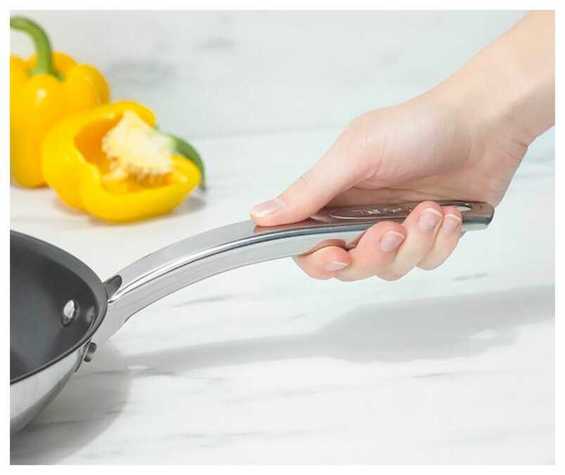 При стандартной жарке ручка остается комфортной для удержания, что подтверждают тесты с индукционными и газовыми плитами. Однако при длительном тушении или работе на максимальной мощности возможен умеренный нагрев. Крепление на заклепках исключает разбалтывание, но негерметичные модели могут накапливать влагу внутри после мытья. -