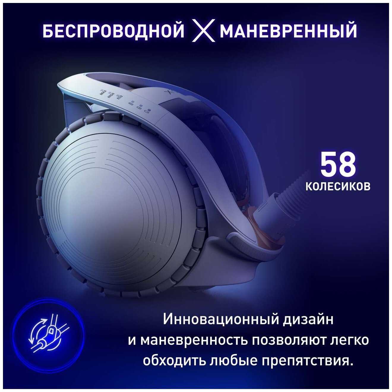 - Вертикальная парковка экономит место: габариты пылесоса — 30×25×110 см.