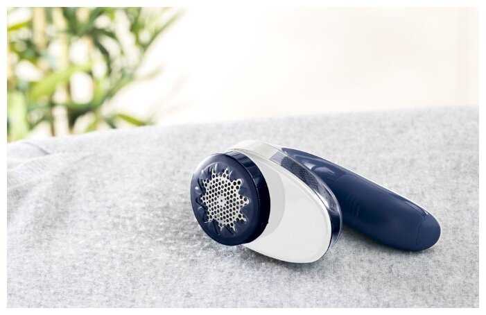 - Три вращающихся лезвия аккуратно срезают катышки, включая застарелые, без повреждения ткани.