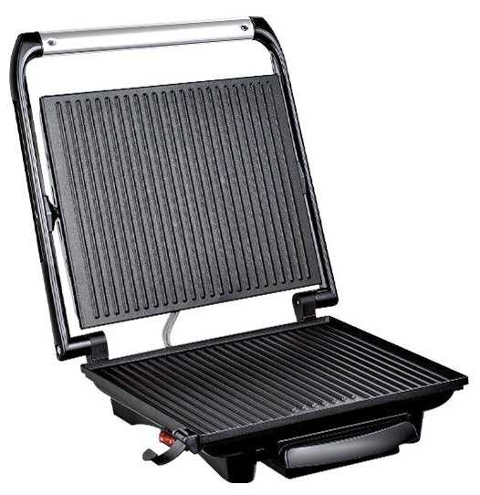 | Особенности : | антипригарное покрытие, контактный гриль, крышка, поддон для сбора жира, решетка, съемные пластины |