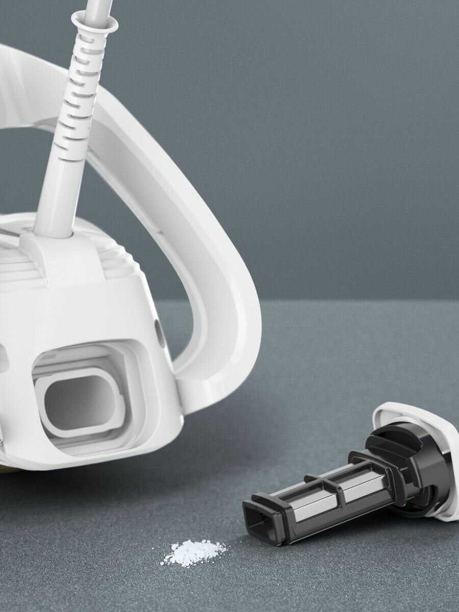 - Встроенный фильтр задерживает до 98% частиц накипи, что продлевает срок службы утюга даже при использовании жёсткой воды.