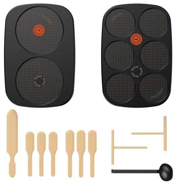 - + Две съёмные панели на 6 маленьких и 2 больших блина, полная комплектация: половник, 6 маленьких лопаток, 1 деревянная большая, выравниватель теста, книга с рецептами. Регулируемая температура.