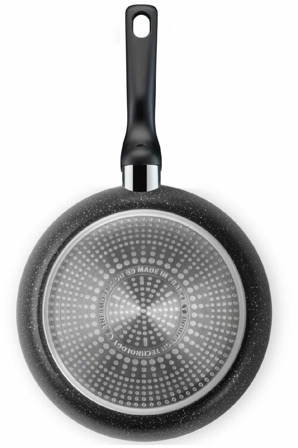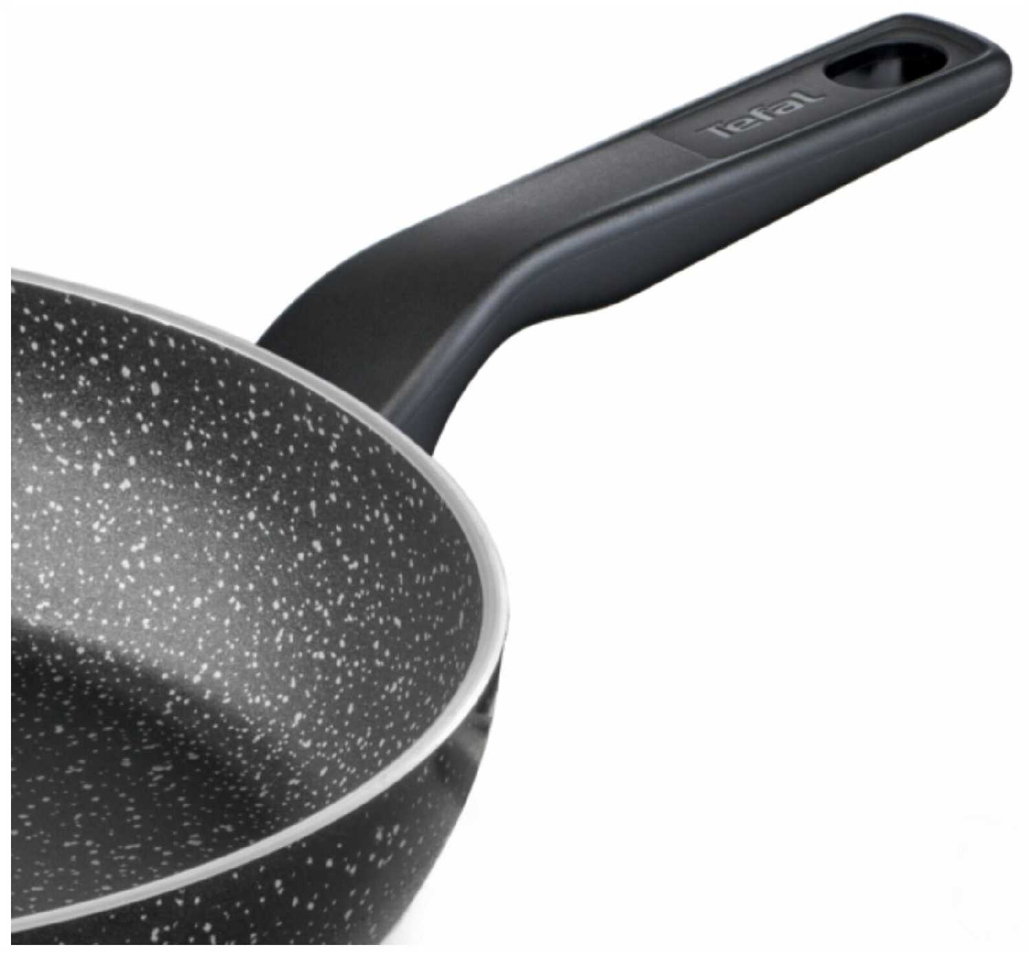 Толстый алюминиевый корпус (особенно дно) обеспечивает быстрый и равномерный нагрев, предотвращая локальные перепады температуры. В сравнении с тонкостенными аналогами это снижает риск пригорания и позволяет готовить без постоянного помешивания, но увеличивает общий вес сковороды. -