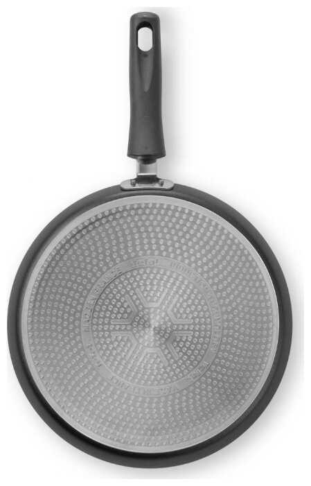 - + Антипригарное покрытие без тефлона, заслуженный бренд, масла практически не требуется, сама сковорода не тоненькая, но дно не утолщенное, для блинов это скорее плюс, сковорода нагревается быстро, понравилась больше, чем предыдущая с толстым дном. Все что жаришь получается равномерно прожаренным. Размер в самый раз, подошел ровно по размеру комфорки.