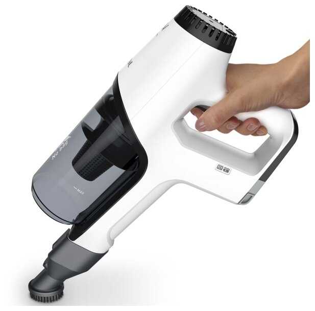- Вес пылесоса (менее 3 кг) и поворотная щетка на 180° позволяют чистить узкие пространства (например, между мебелью) без физической нагрузки.