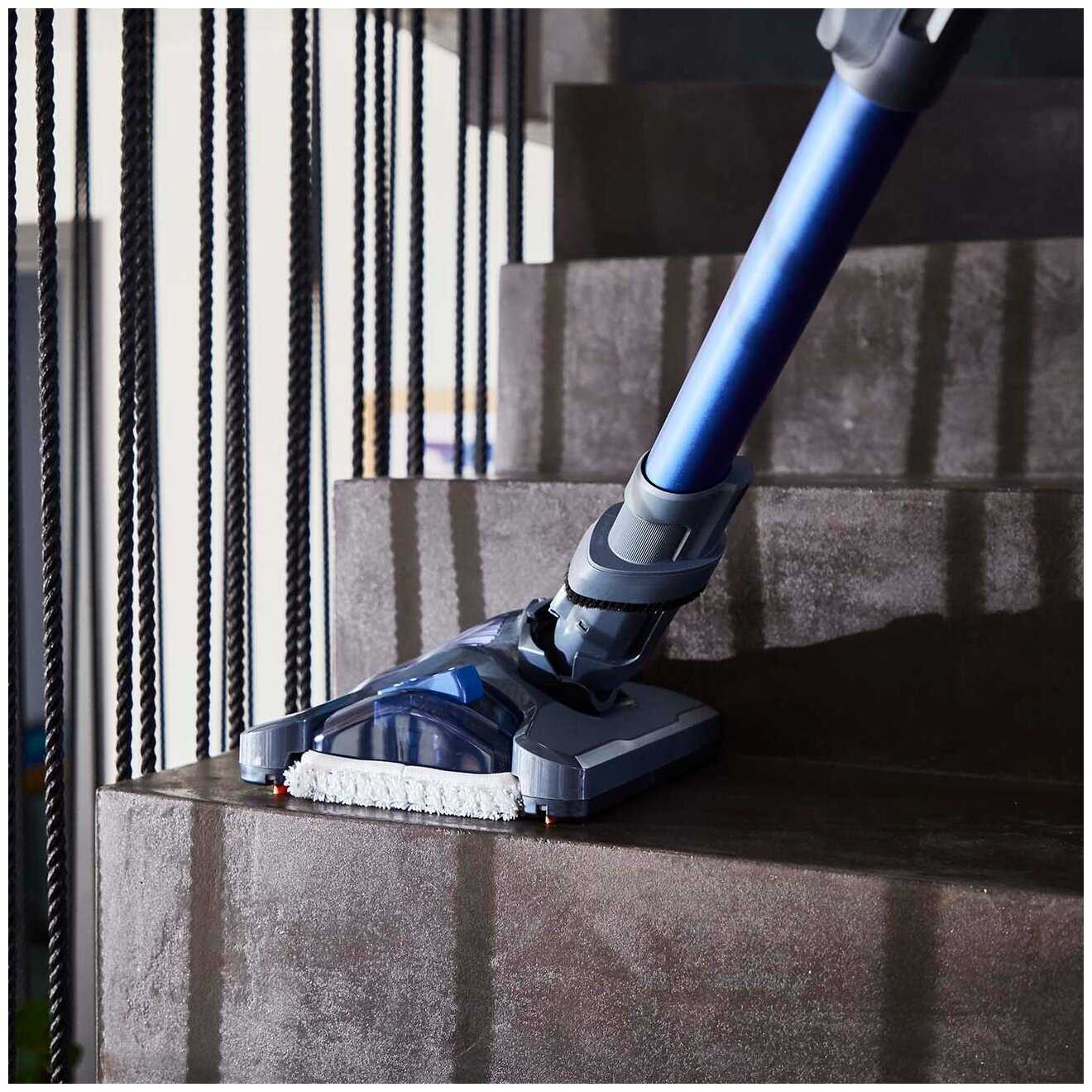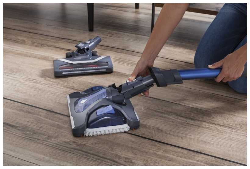 - Специальная насадка одновременно собирает сухой мусор и моет пол, сокращая время уборки вдвое.