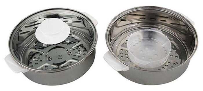 - + Две стальные кастрюли из нержавеющей стали с пластиковыми ручками, простое информативное управление, на тумблере указан вид продукта и время готовки, легко разобраться